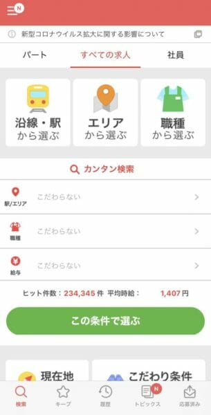上記の画像は、バイトルのスマホアプリにおけるトップページです。