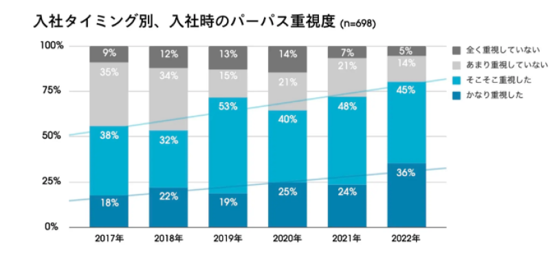 また、下表は入社時のパーパス重視度についてまとめられたものです。Wantedlyは「共感」をベースにしたサービスですが、そのコンセプト通りパーパスを重視する求職者が多く、2022年を見ると全体の約8割がパーパスを重視しています。